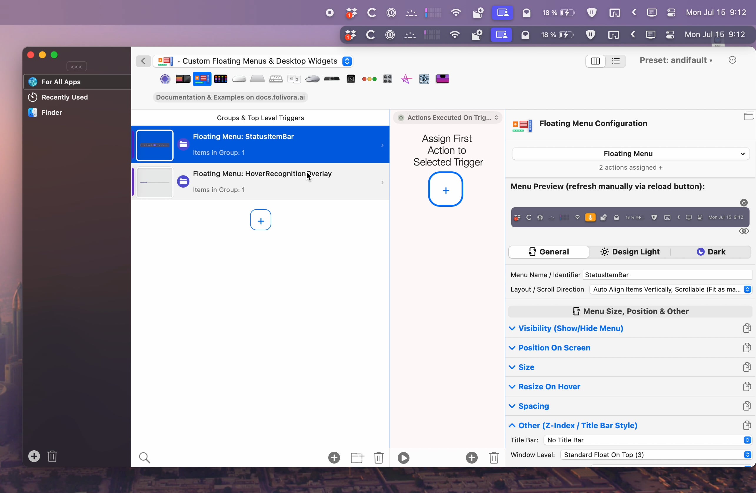 A "Menubar Status Item" Widget that can be placed in a Floating Menu
